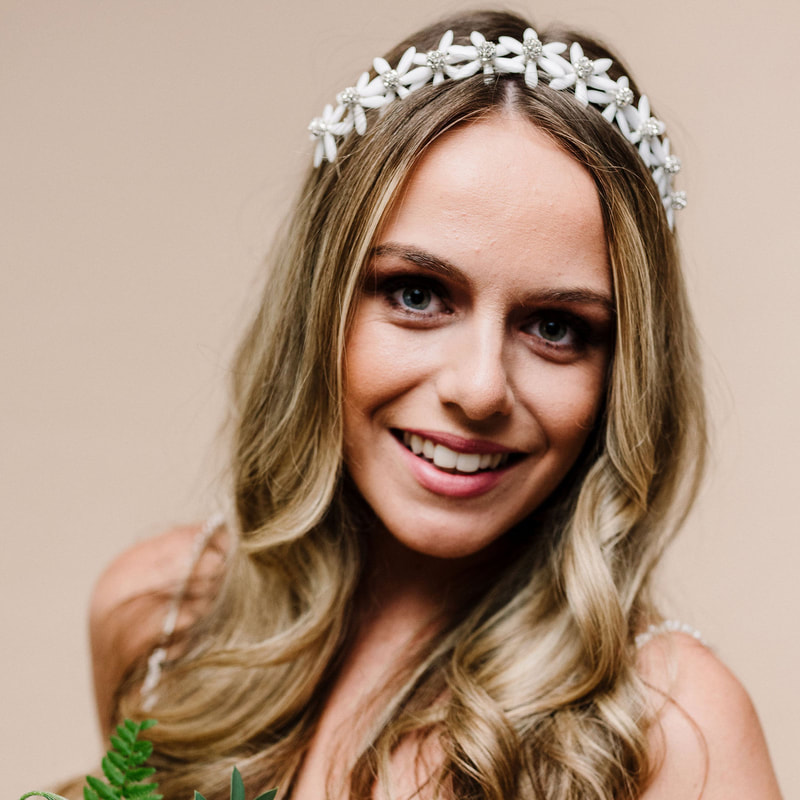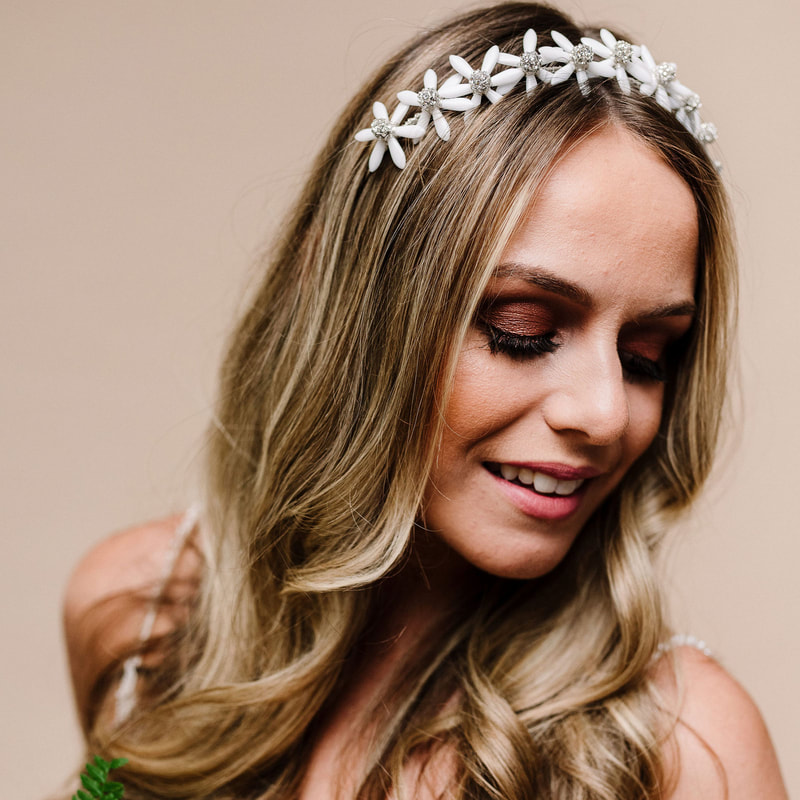 Each daisy is individually handmade from chalk white petal beads and finished with a pave diamante bead in the centre before being wired onto a headband.