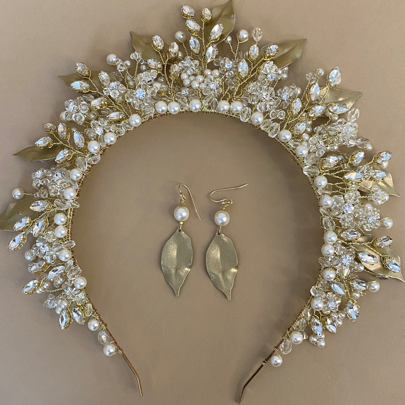 With a mix of leaf, pearls and crystals all wired by hand onto a metal headband. This tiara is fully customisable with your choice of pearl, crystal and wire colour options.