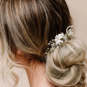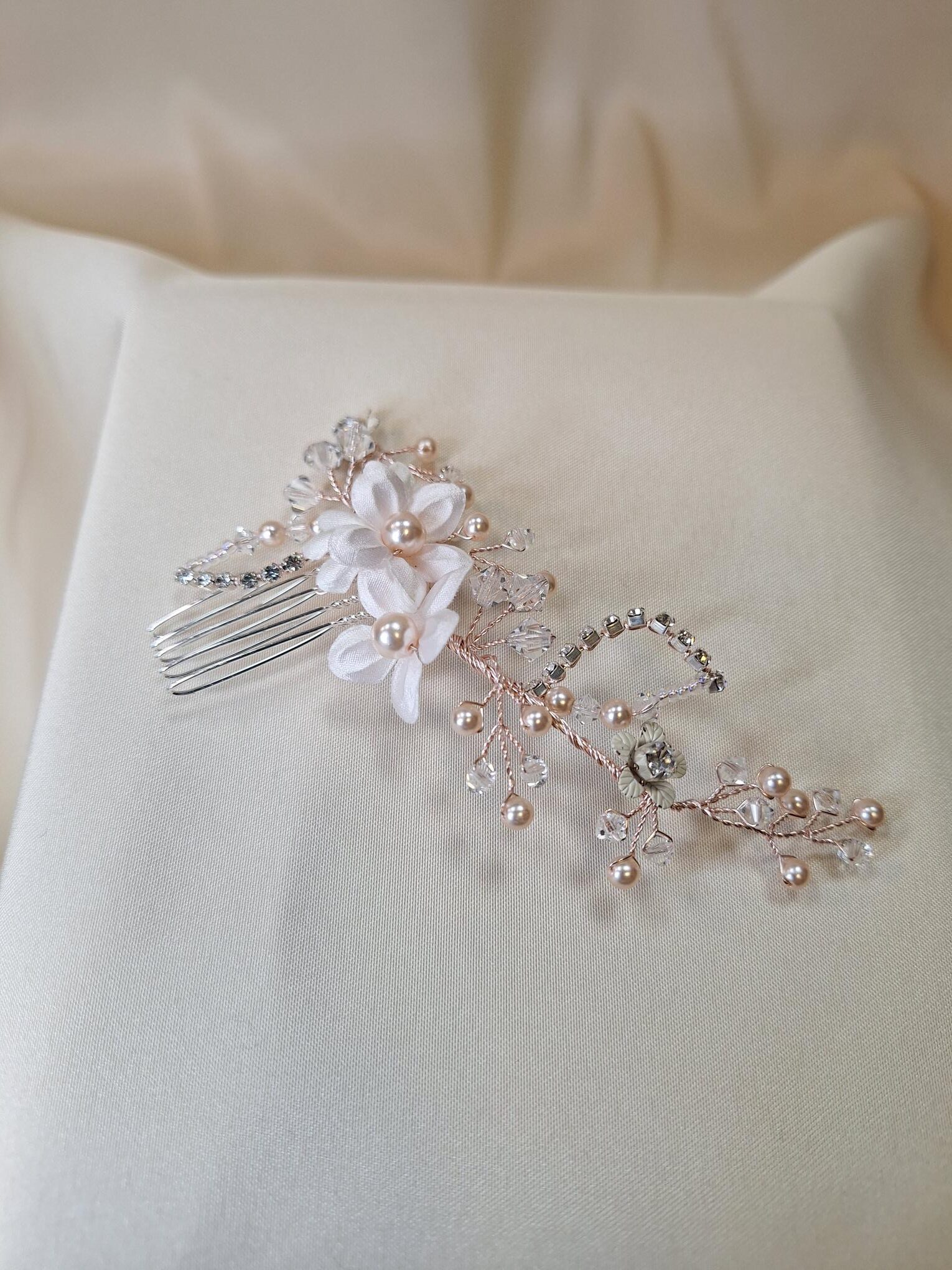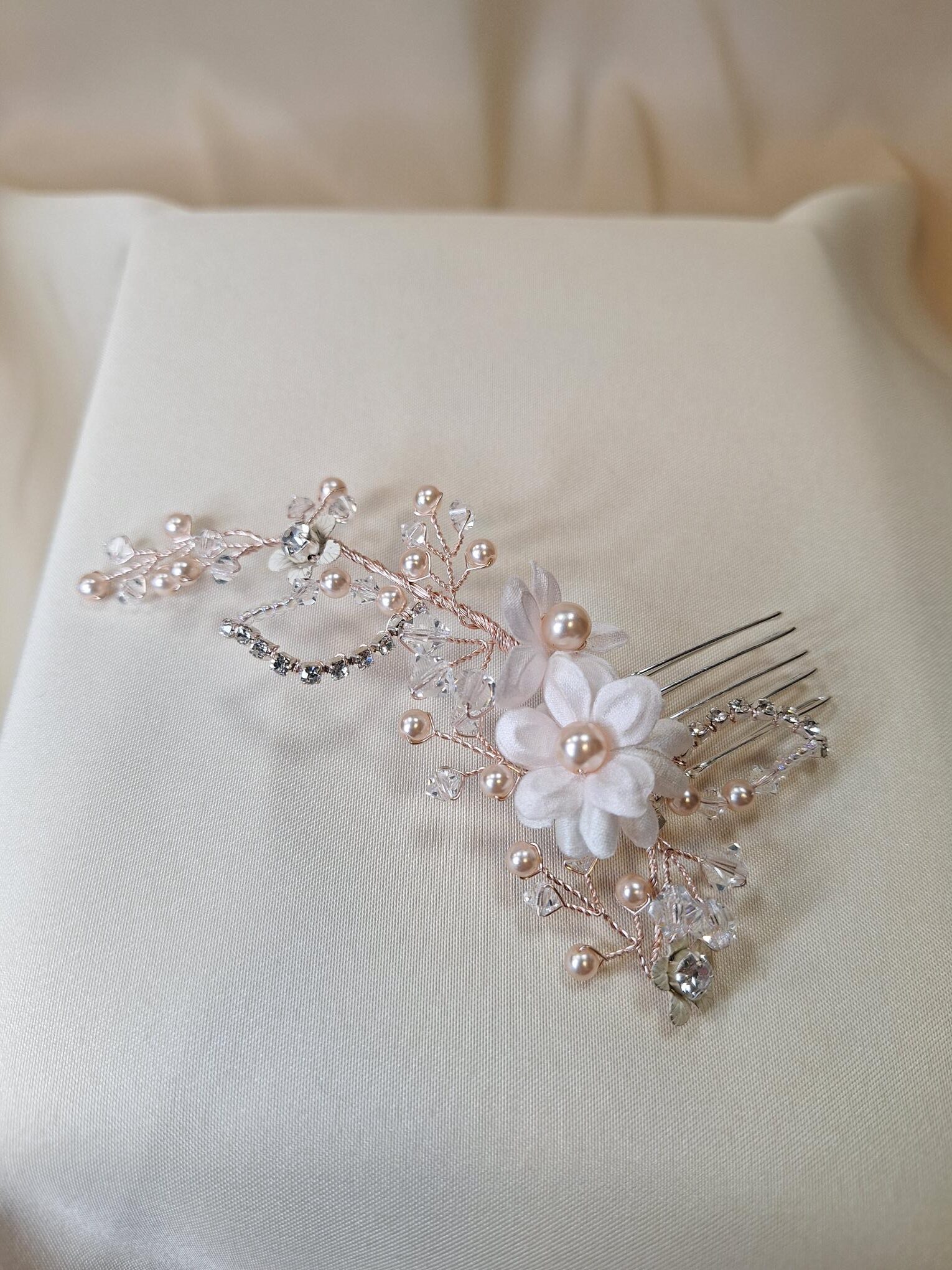 If your looking for something different with a little blush and Rose Gold colour, then this is the hair piece for you, beautifully handcrafted with fabric flowers, blush pearls and clear beads.