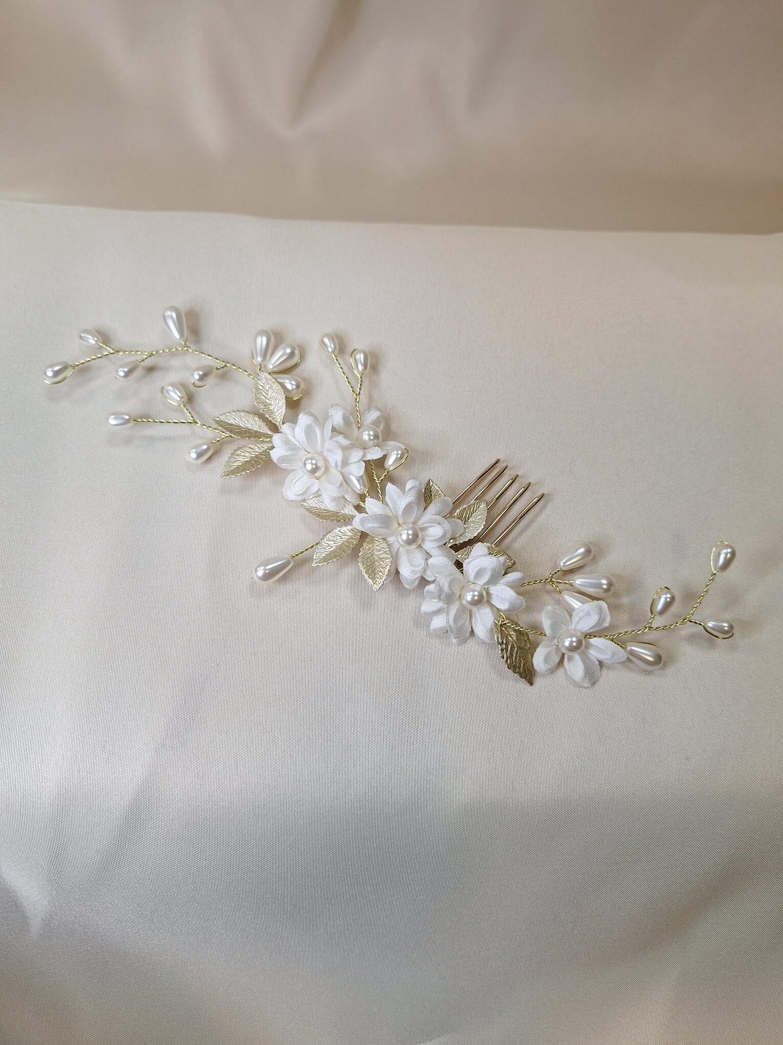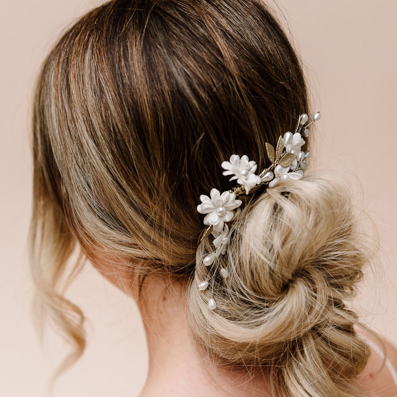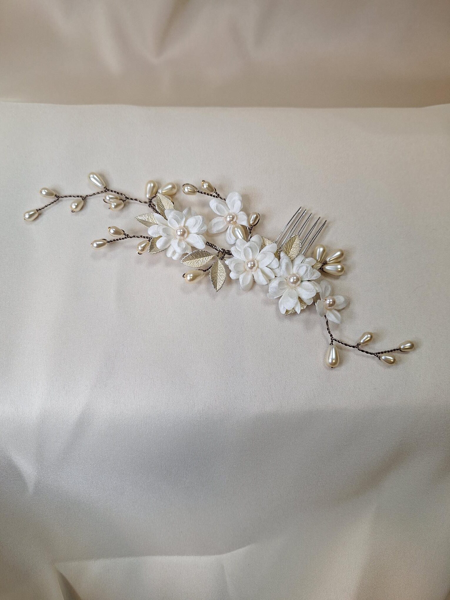 A stunning pearl hair comb with 3D floral details on brown wire for a naturalistic look. soft gold