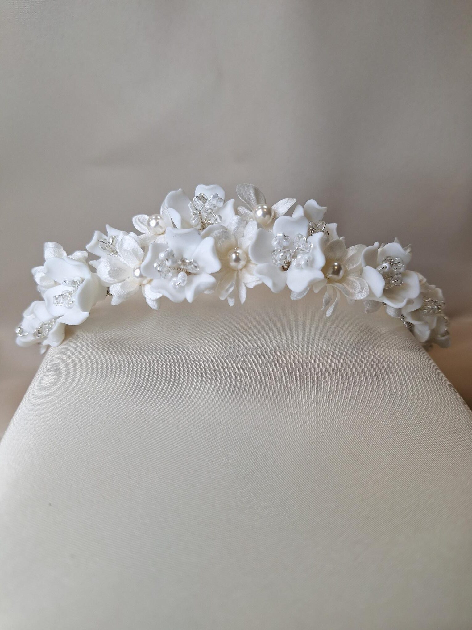 Beautiful delicate flower tiara made up of Porcelain and material flowers, decorated with Ivory pearls and clear crystals.