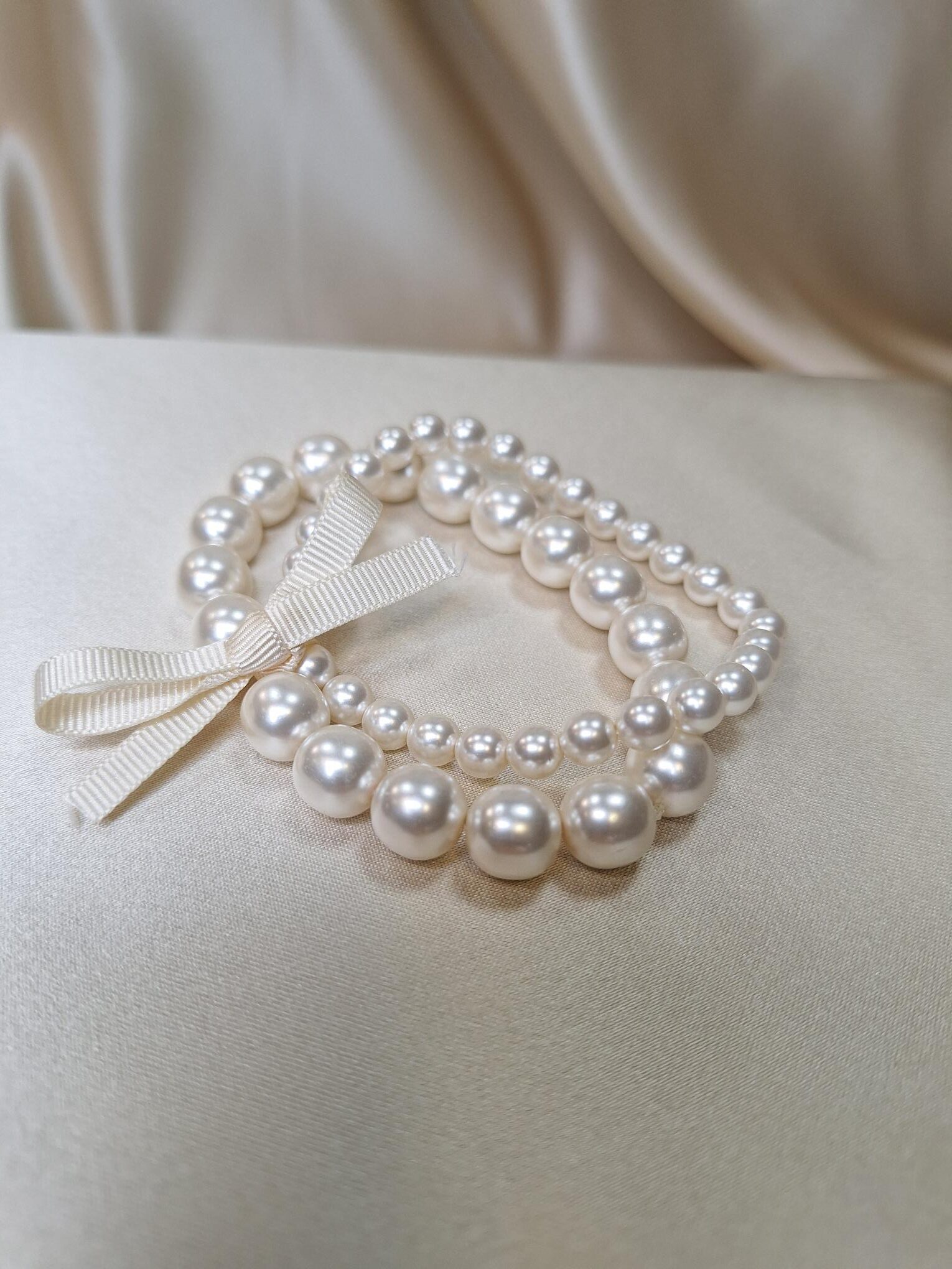 Designed for a city-chic goddess, we love this double layer strand pearl bracelet. The blush grosgrain bow just completes it.