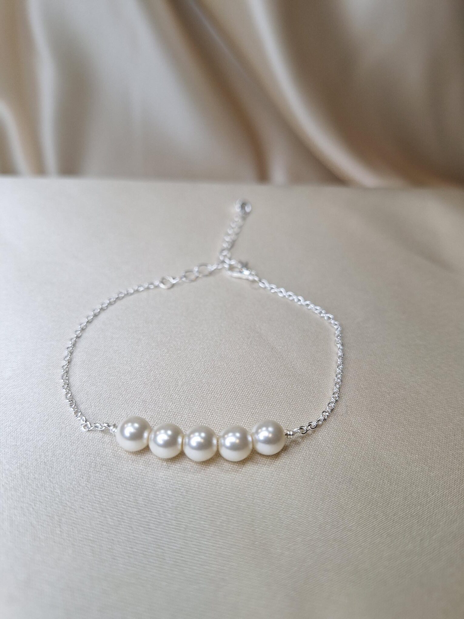 Five freshwater pearls are threaded onto a delicate silver chain for minimal styling.